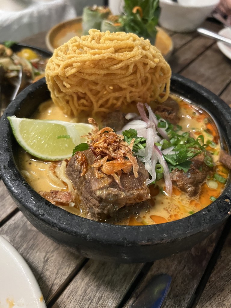 I also have had the khao soi here as well and it is also incredibly. Khao soi is a curry noodle soup that is coconut-based and originated from Northern Thailand. There are actually several versions of this spicy, complex noodle dish, but this coconut-based version with egg and rice flour noodles is likely the most common one you’ll find in Southern California. The crispy noodles were crunchy to perfect. The soup was spicy in a very satisfying and complex way. The beef cuts were also soft and flavorful.